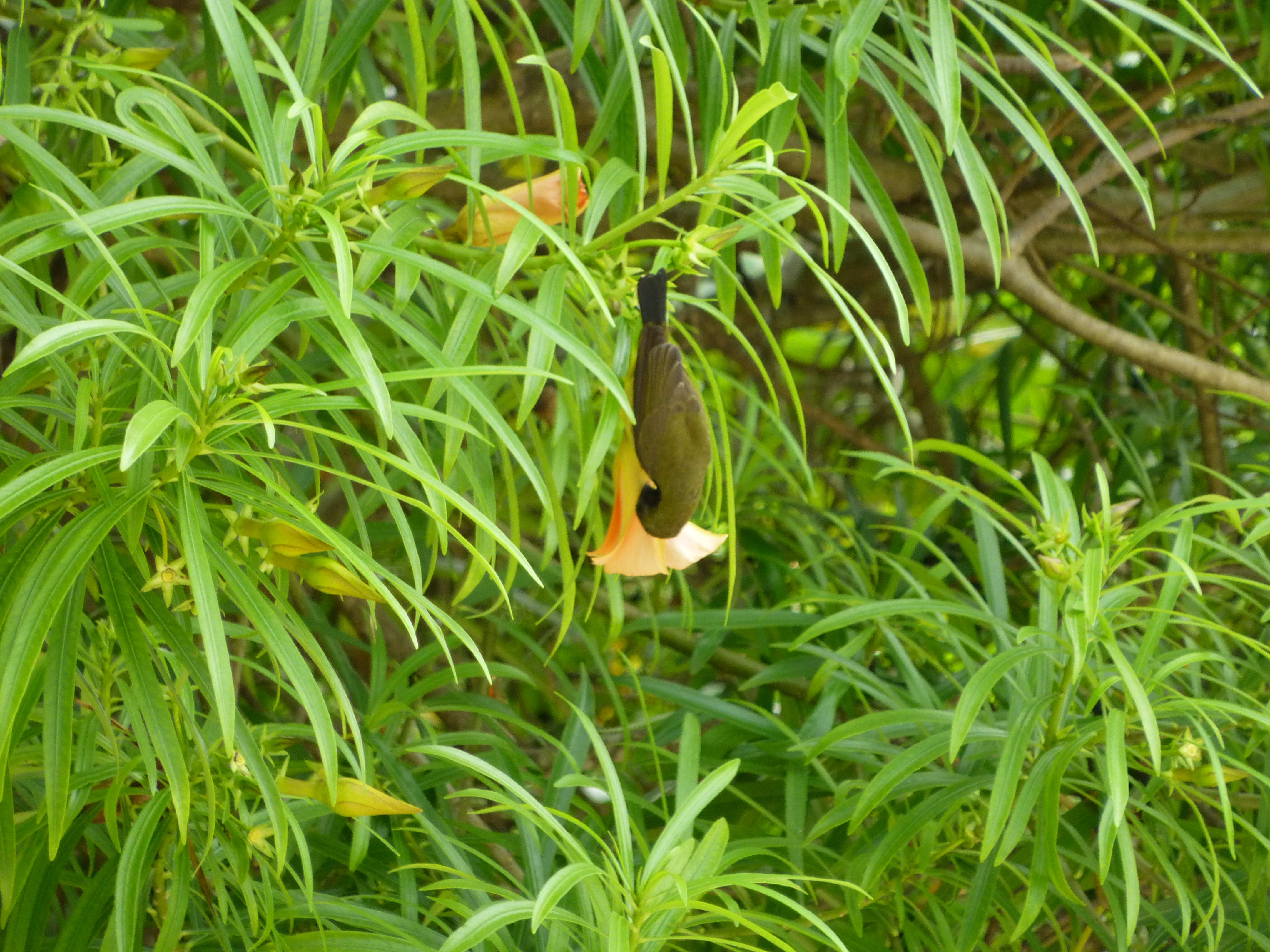 Vögelchen, welches den Nektar von hinten aus den Blüten holt - danach fallen die Blüten ab.