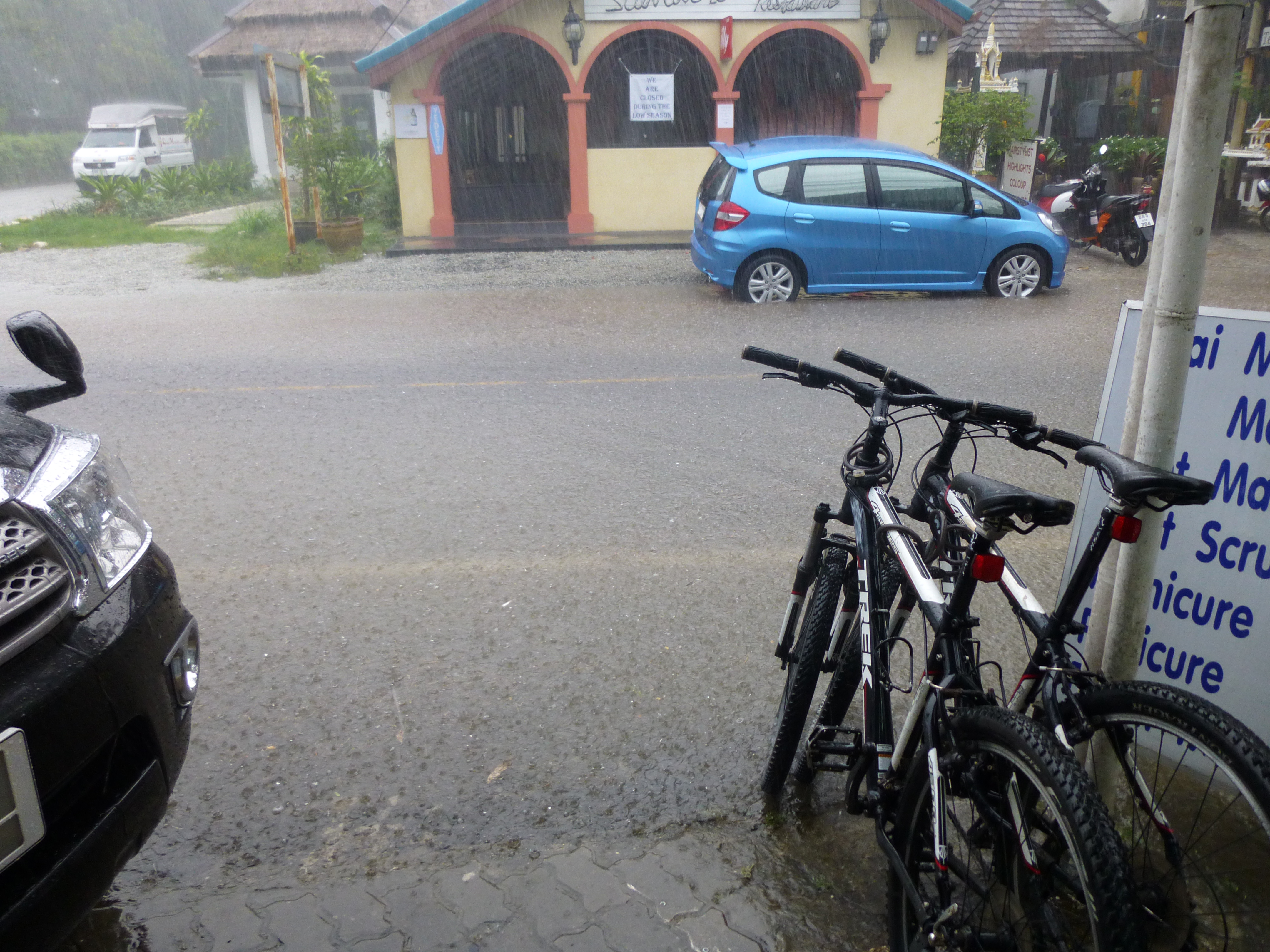 Wir leihen uns Räder im Hotel aus und fahren zum Schneider. Als wir dort sind, fängt es an, wie aus Eimern zu giesen - es ist ja auch Regenzeit!
