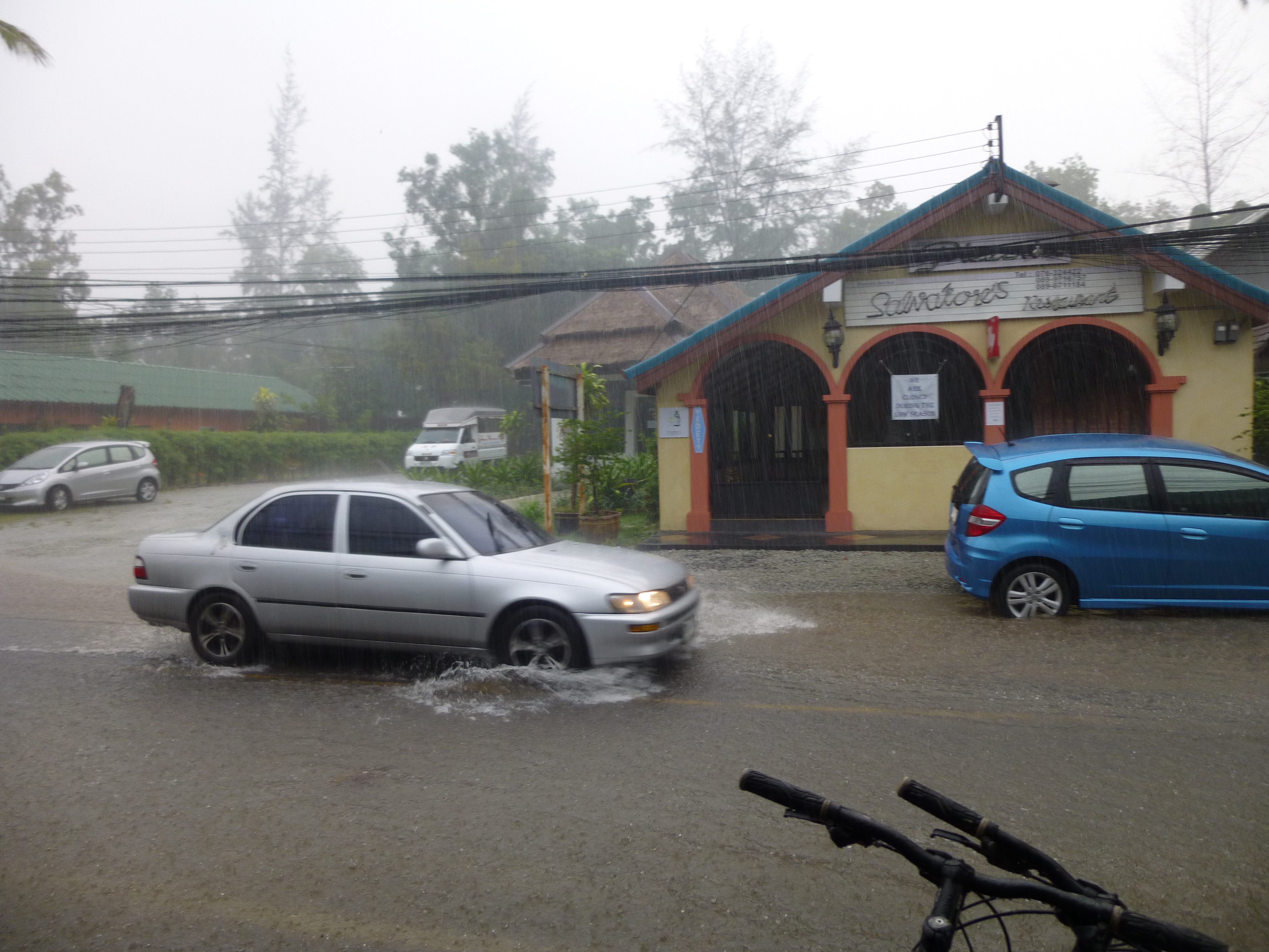 Die Straße steht sofort unter Wasser, der viele Regen kann nicht abfließen.